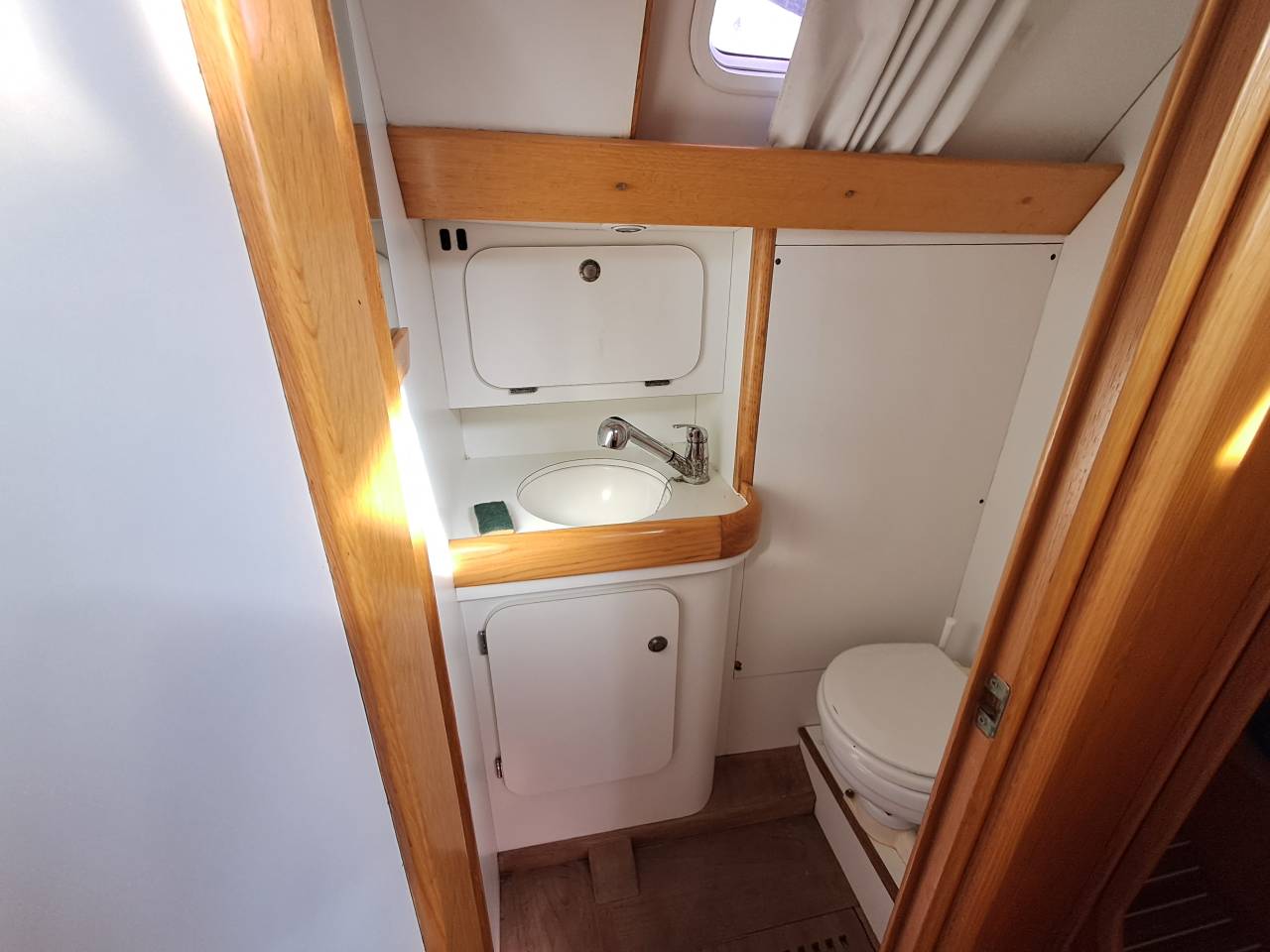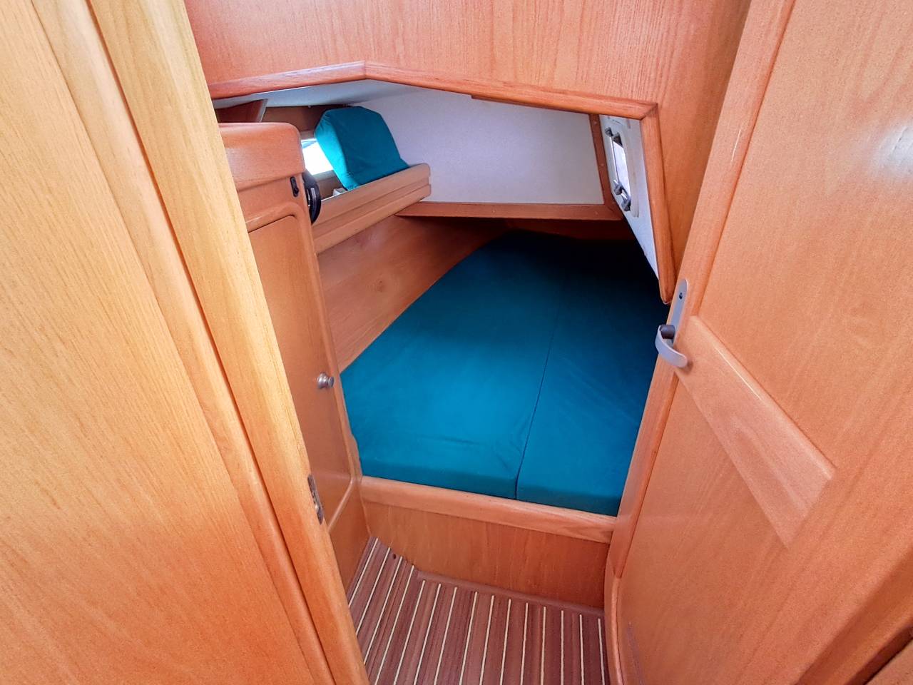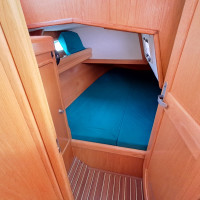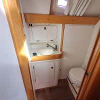 In term of equipment, the central table, large icebox, 2 stainless steel sinks and plenty of storage space make life on board easy. This is a very pleasant yacht to live aboard, with a spacious, light-filled interior.