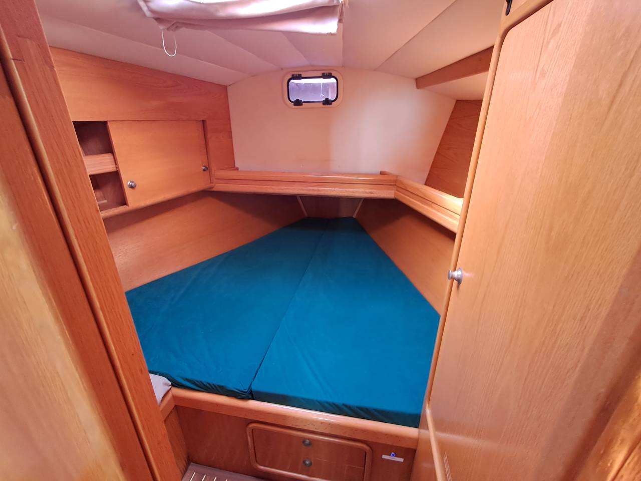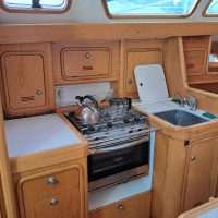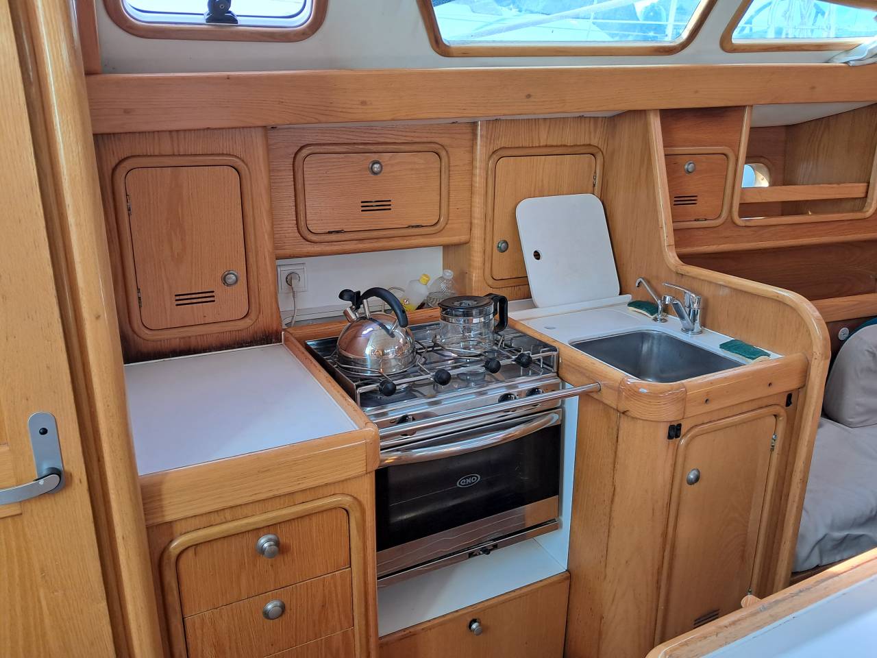 The interior fittings are warm and comfortable, with a lots of wood. She has 3 cosy and confortable double cabins and 2 berths in the saloon.