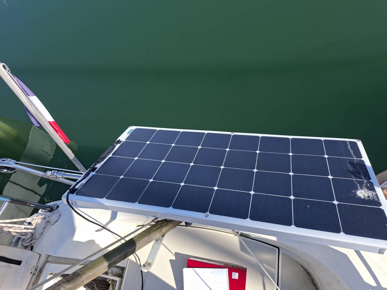 Panneau solaire Sun power 120W neuf (février 2025) avec support sur balcon arrière.